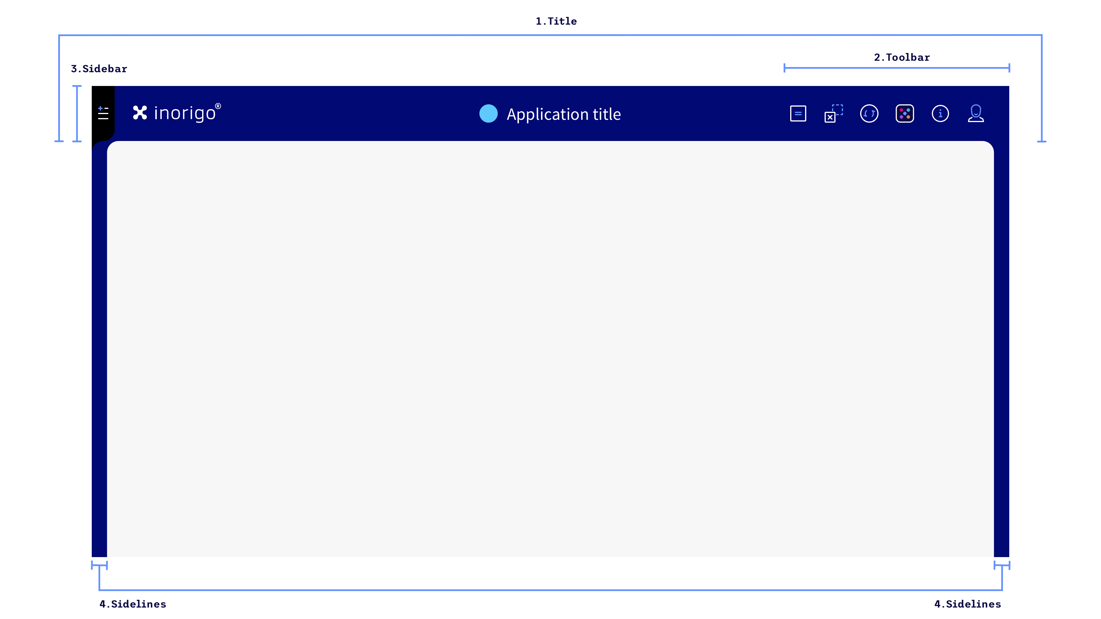 Layout anatomy of an application: Title (1), Toolbar (2), Sidebar (3), Sidelines (4)