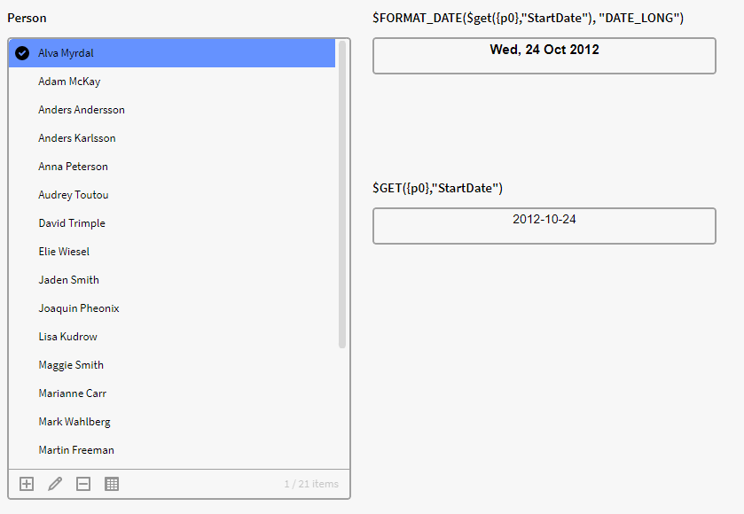 Example: $FORMAT_DATE($GET({p0},"StartDate"), "DATE_LONG")