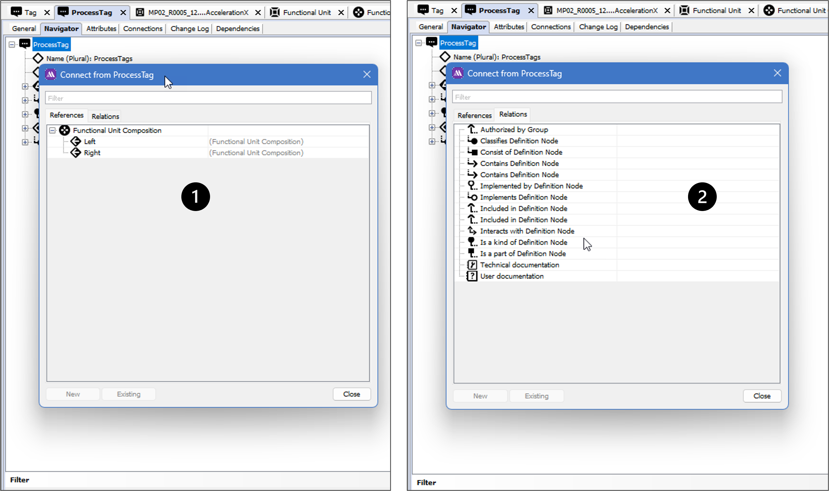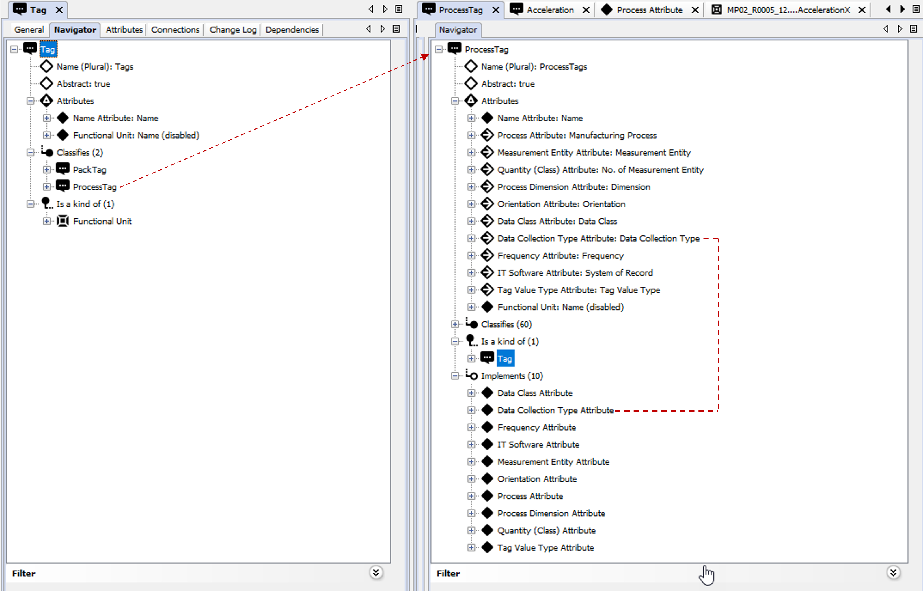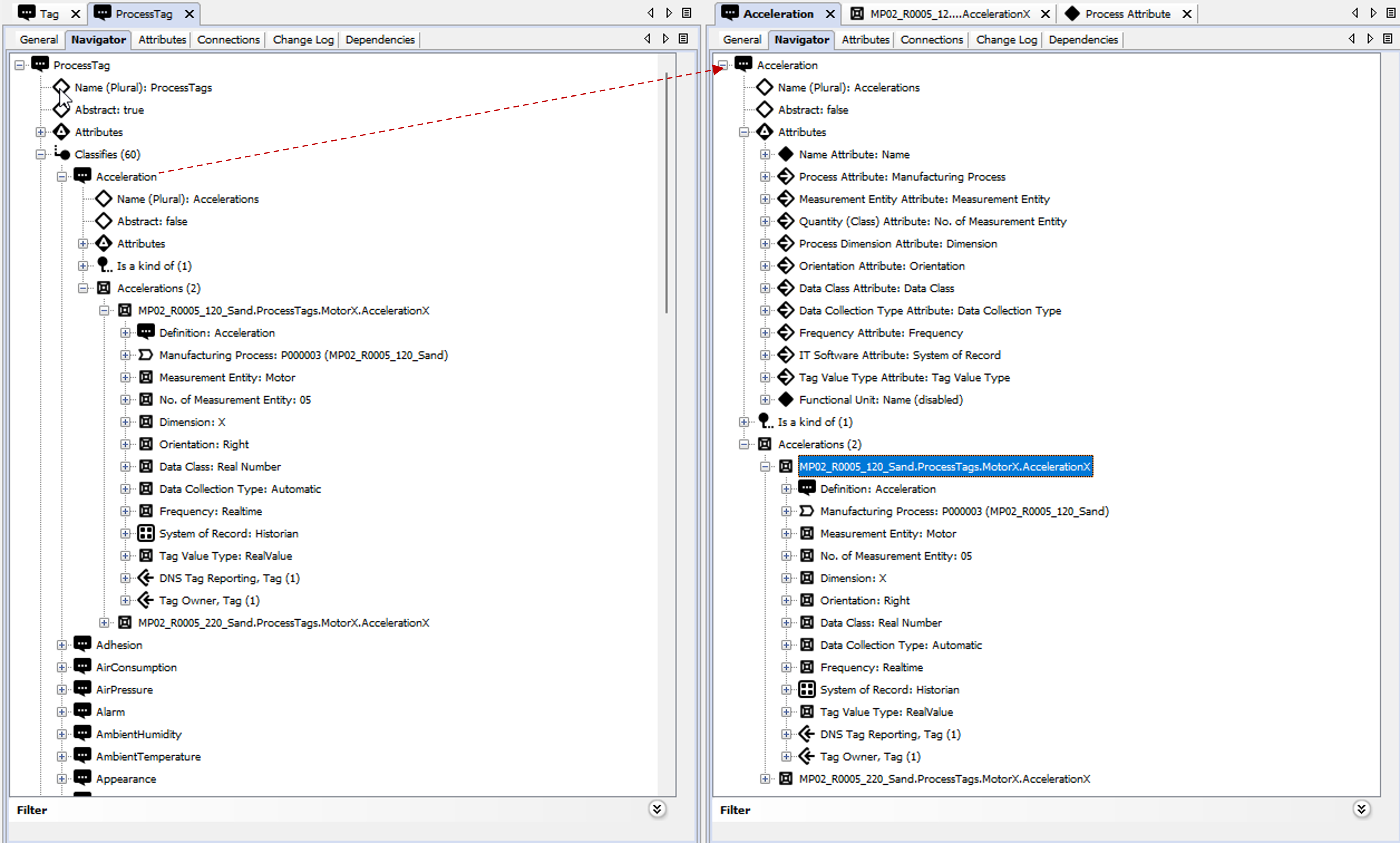 The navigator tree from a Definition Node point of view displays the following parts depending on what has been defined and connected on that object. In the example below there are two trees next to each other. To the left there is the TAG Definition Node and to the right the is the ProcessTag Definition classified by the TAG.