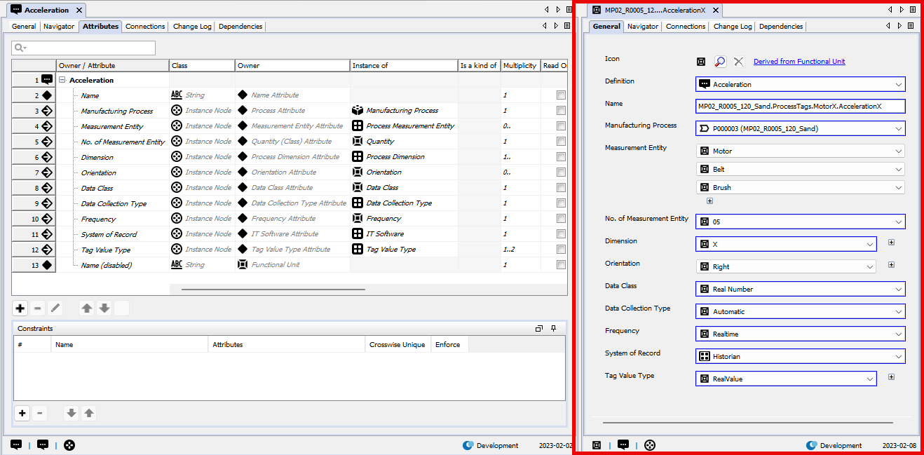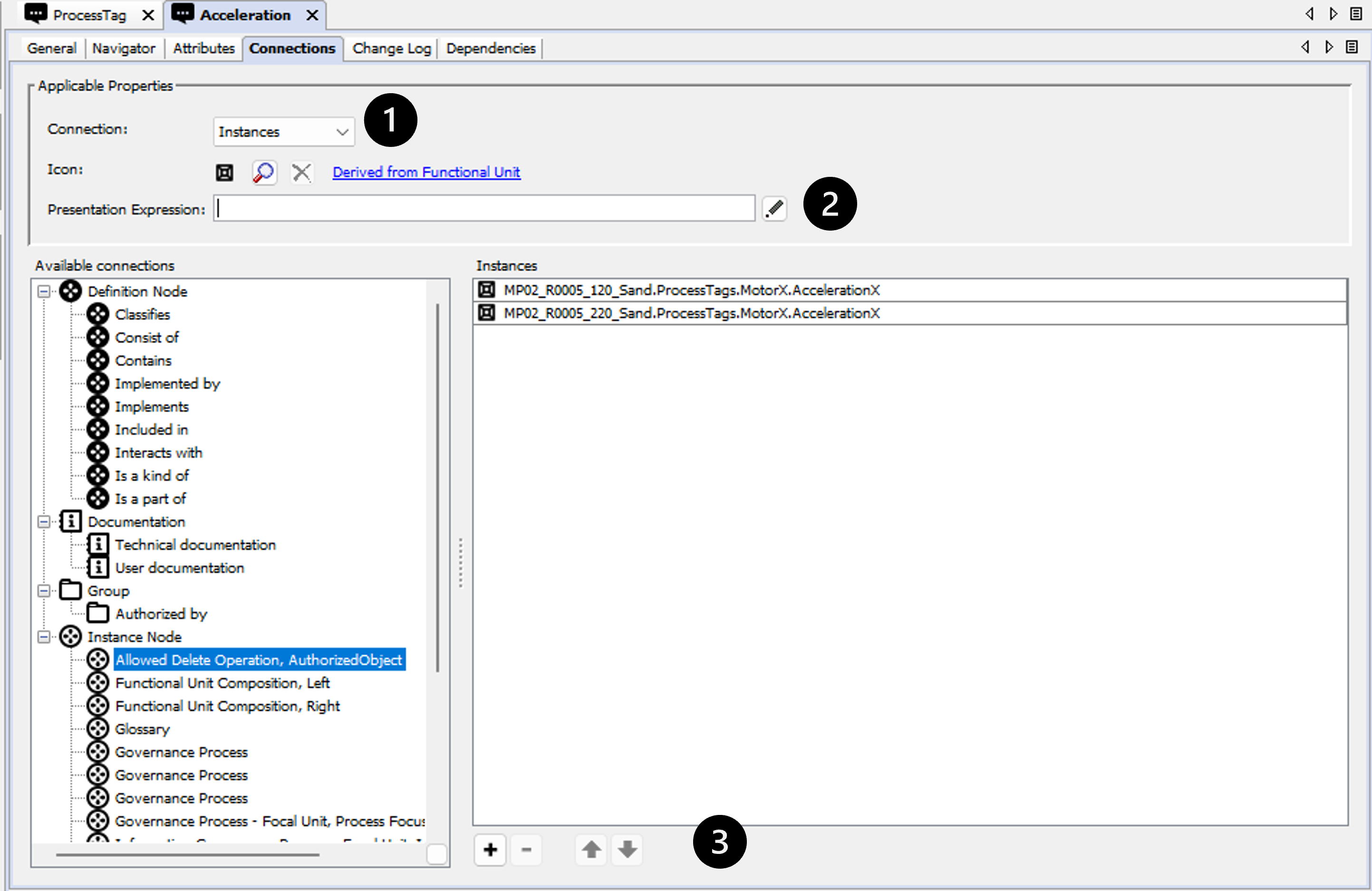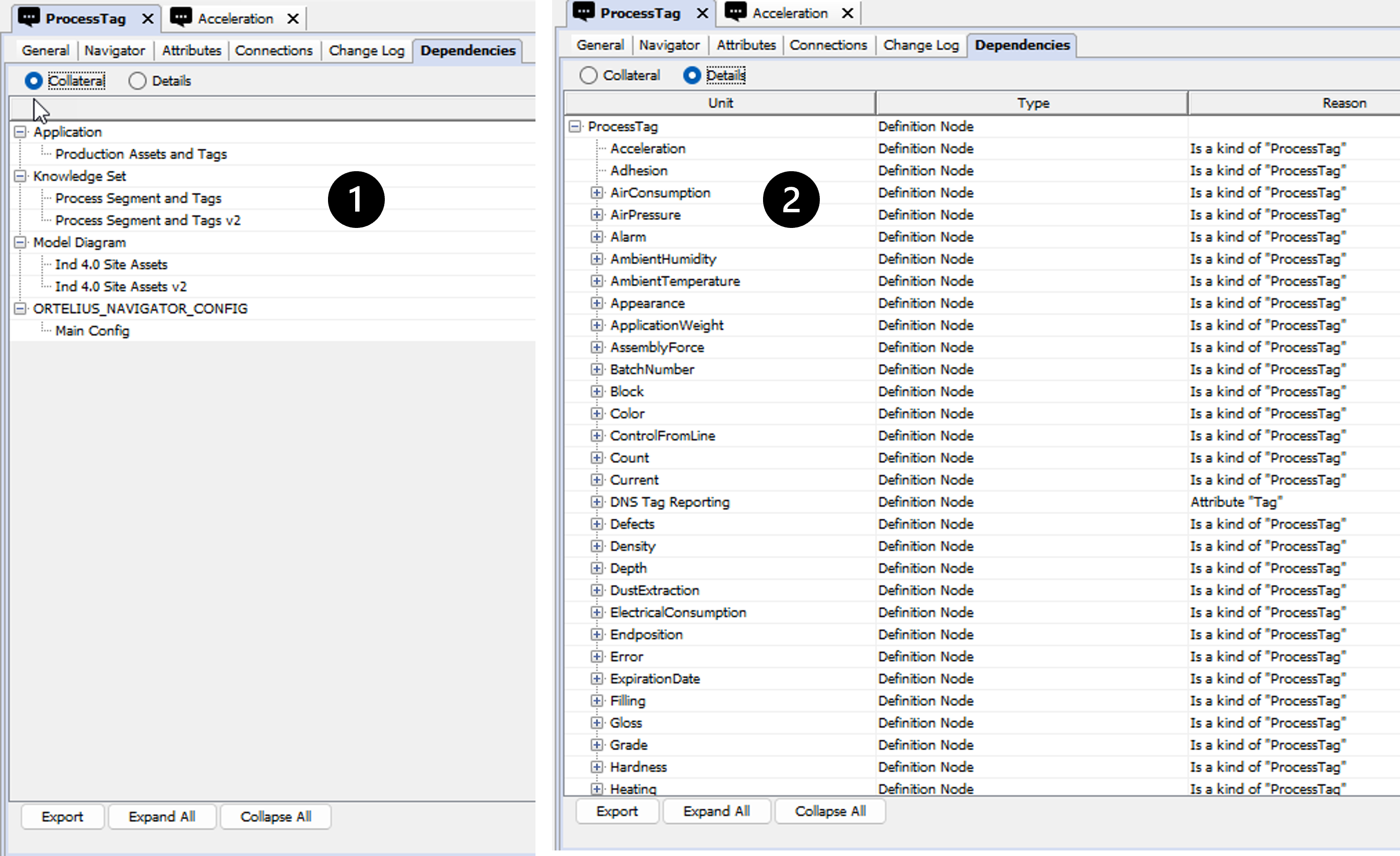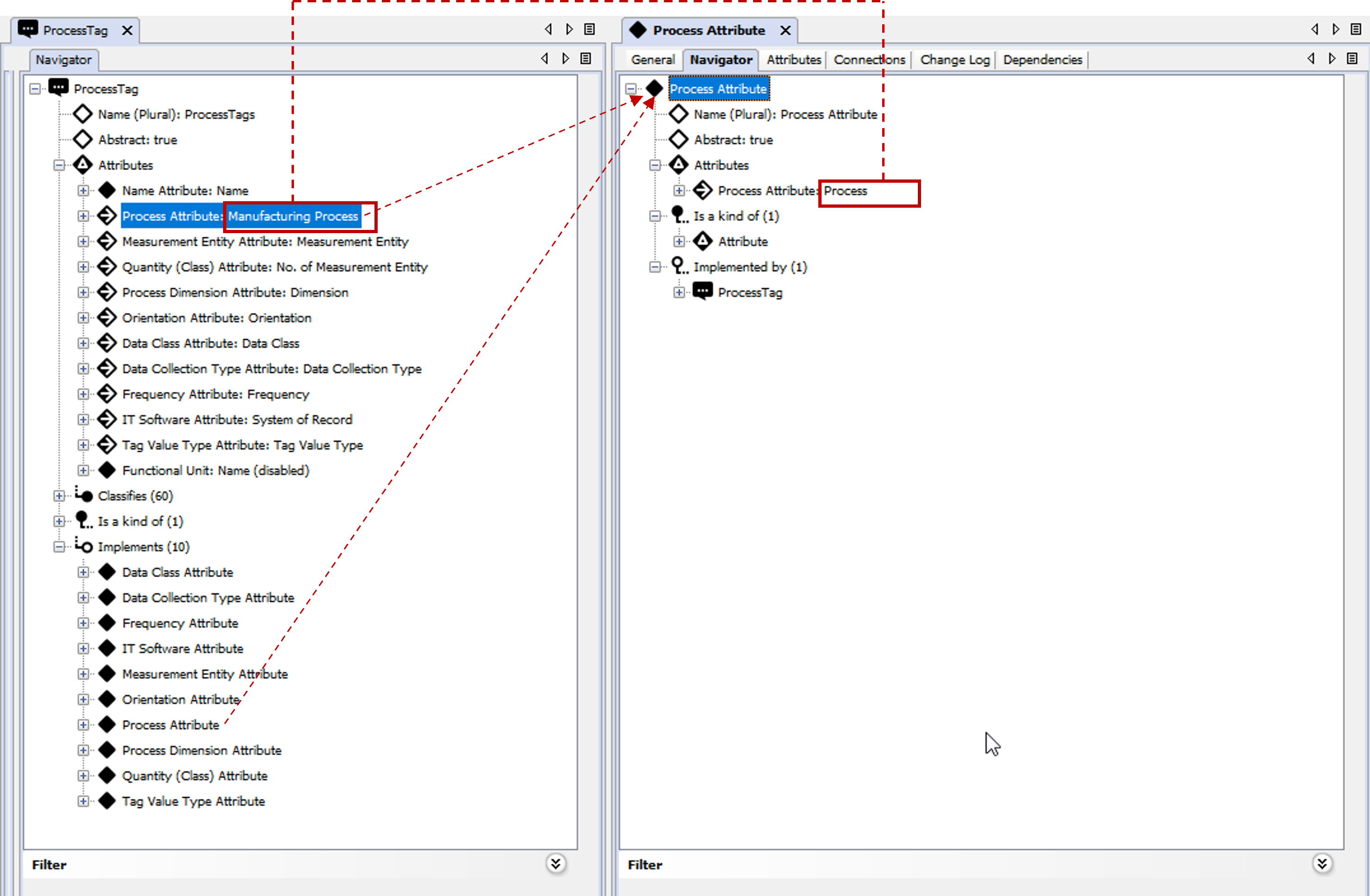 The navigator tree from a Definition Node point of view displays the following parts depending on what has been defined and connected on that object. In the example below there are two trees next to each other. To the left there is the TAG Definition Node and to the right the is the ProcessTag Definition classified by the TAG.