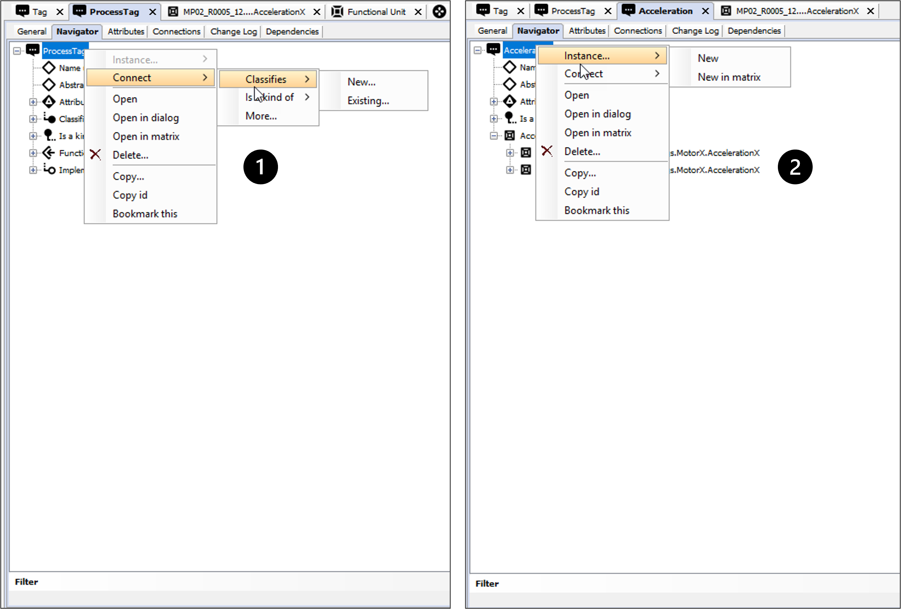 Note: Every inorigo® relation has a two paired name like: Classifies-Is a Kind Of, Consist of-Is part of, Implements-Implemented By. Both names will appear, if valid, in the Navigator tree like in the example below. Since the Node TAG is classified by Functional Unit then it is shown as s a Kind of Functional Unit, so the tree can be infinitely expanded in the navigation tab,
