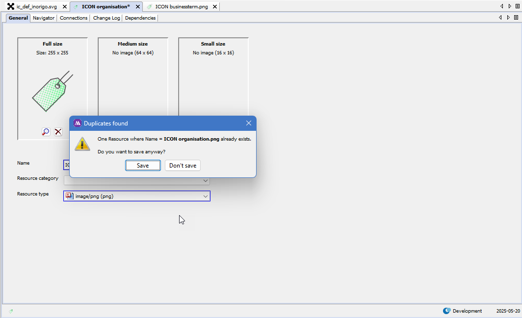 If you select a file which has the same name you will be prompted to either update the existing resource or to create a new one. This feature prevents the risk of having duplicate resources in inorigo®.