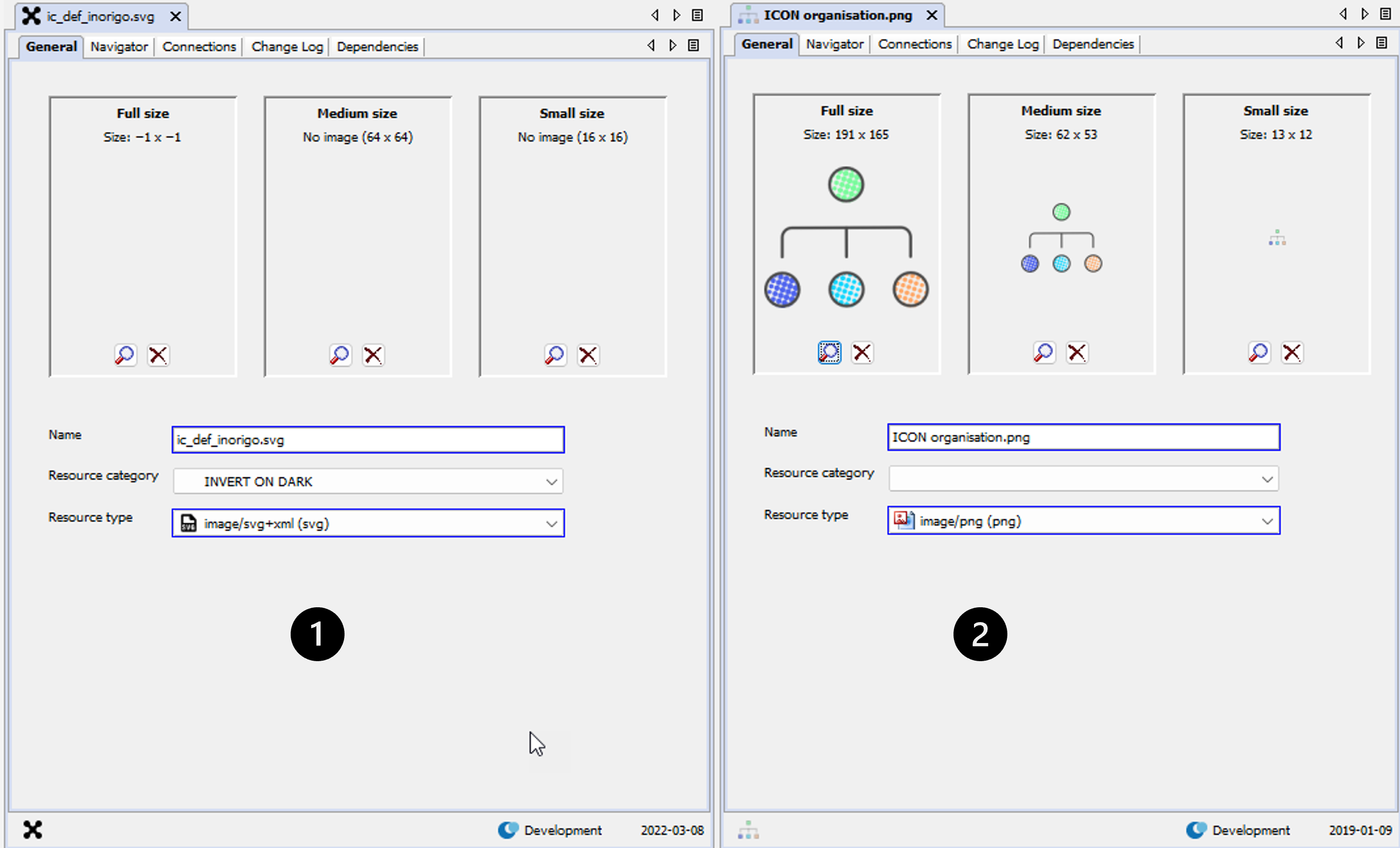 An update of a resource will immediately refresh the display of the resource throughout the application. There is one exception though; static icons & images in user interface elements (such as buttons, menus and toolbars) are NOT guaranteed to be refreshed directly as a resource is updated. If the icon is located within a document tab or an Application a mere reopen of the tab or Application will show the new icon. In other cases it may even require a restart of the entire application in order to refresh certain elements.