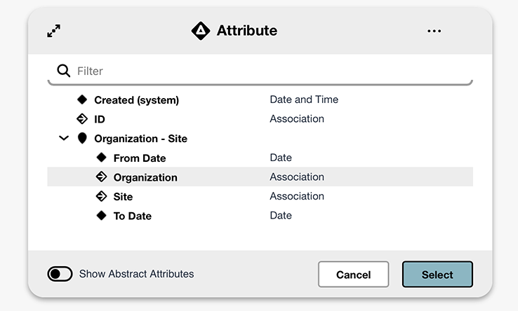 When you add an Attribute criterion, a dialog will open with the available attributes.