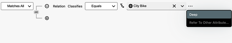The deep function is available when creating a criterion based on a Relation. After an relation and definition has been selected, hover anywhere over the row to reveal a […] menu at the end of the criterion. From here it is possible to select Deep. When enabled an icon looking like it's "drilling down" is shown.