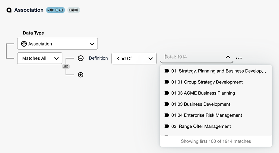 When you add a Definition criterion, a dropdown menu will appear with the Kind Of operator selected by default. The input field will list the total number of Definitions available but the list will only show the 100 first matches.