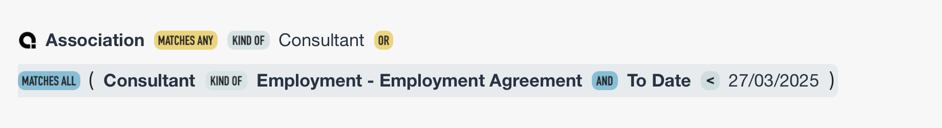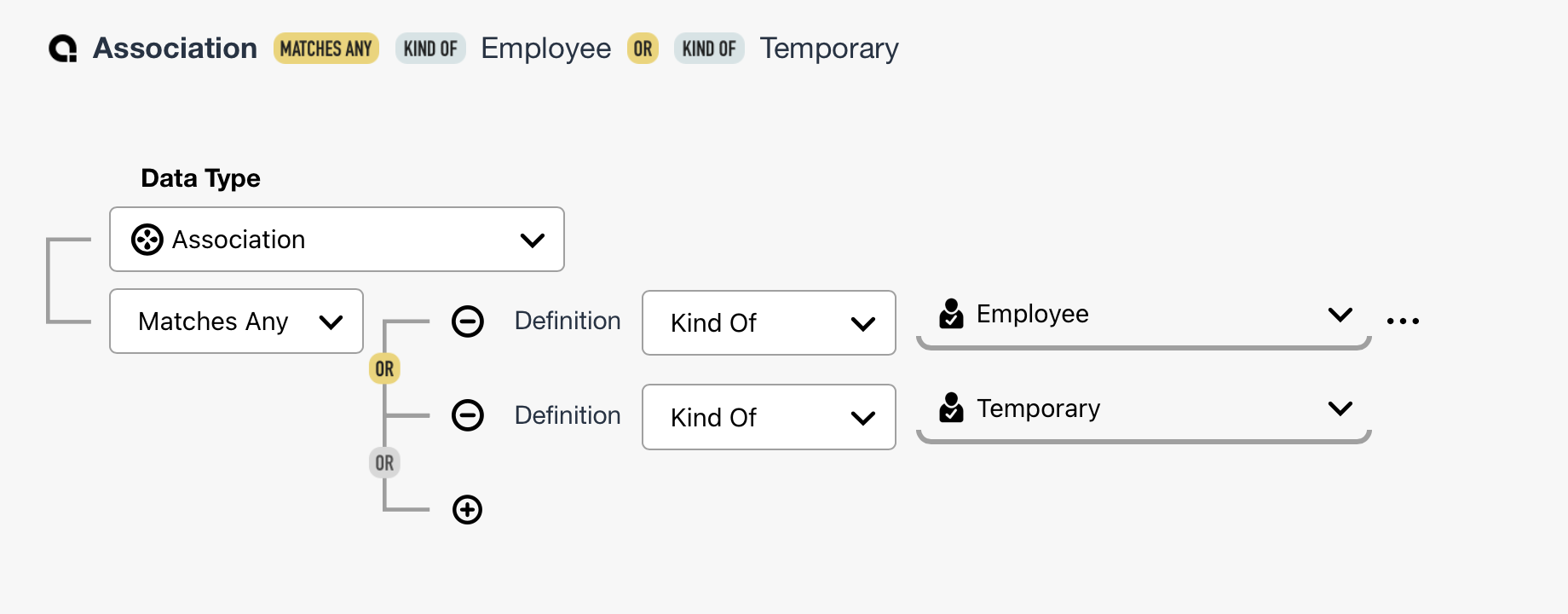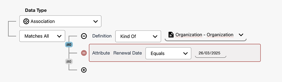 When the Data Type is set to Association (the default), the Query Editor will automatically add the first criterion, set to Definition. This is since an association always requires a definition.