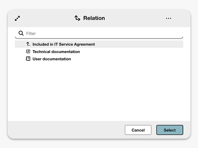 When you add a Relation criterion, the available relations are determined by the Definition or Kind Of filters already present in your query. These filters provide the context needed to decide which relations should be available.