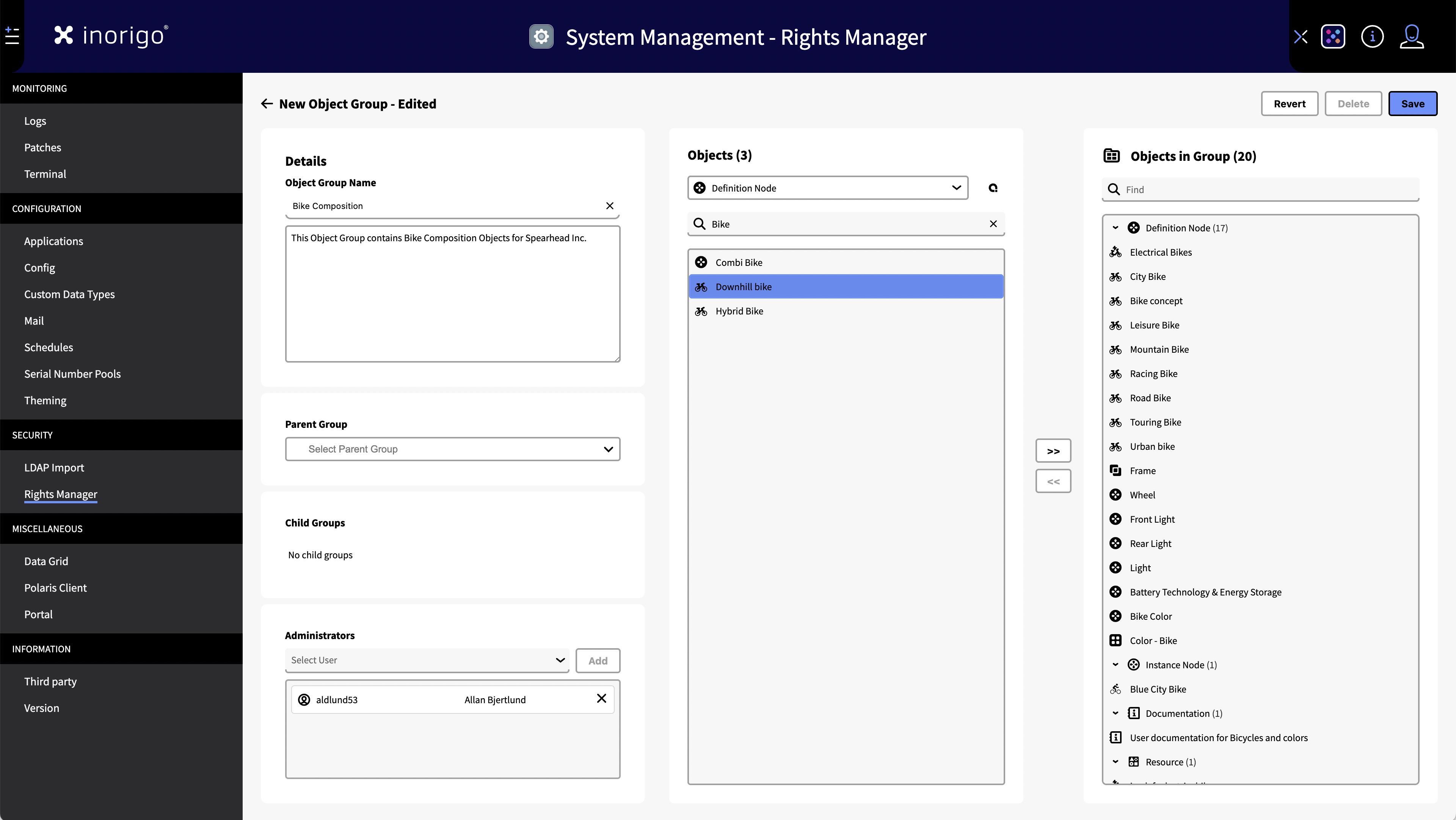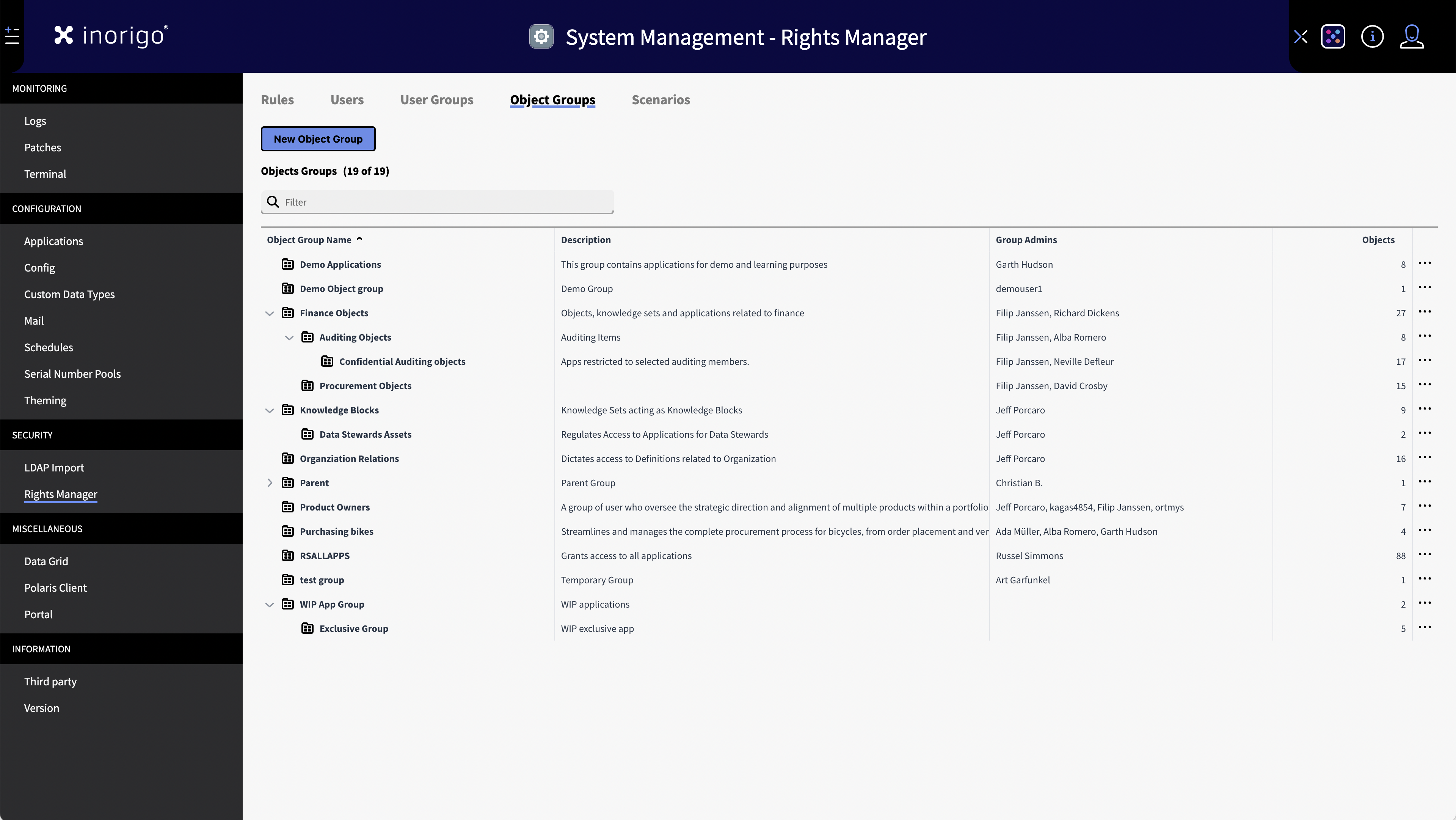 - Object Groups: To Manage Object groups. Object groups, can contain any combination of inorigo® objects.