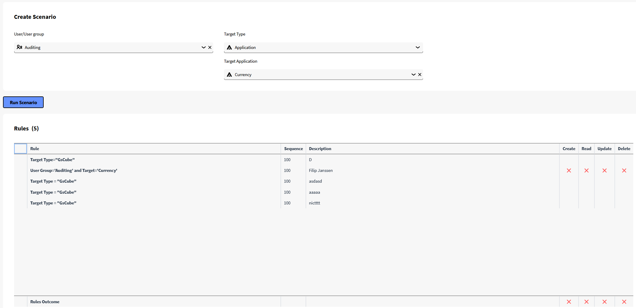 Once a scenario is set up, it displays all rules that grant or restrict access for the selected user or user group to the chosen target. It also shows the specific permissions each rule provides, in the order they are applied.