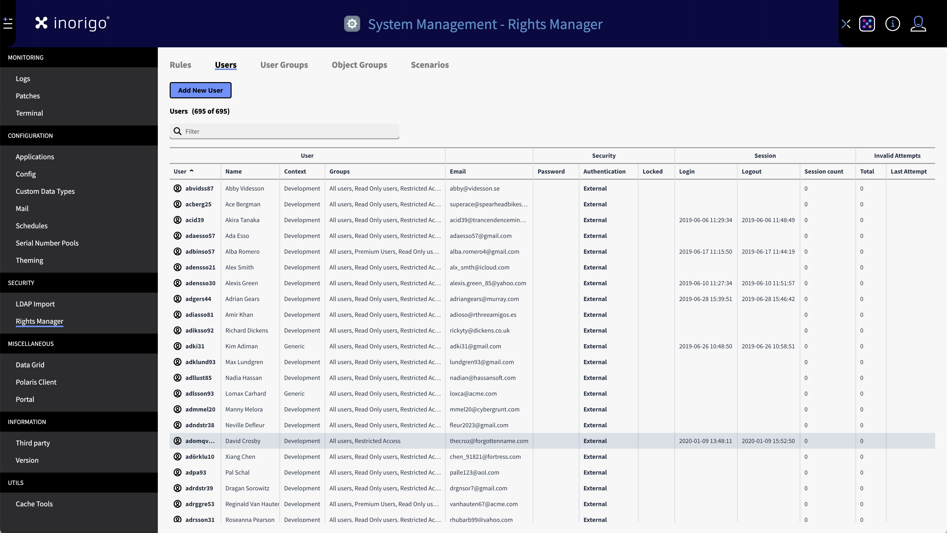 With this you can add new users and view relevant user information, such as,, the context they are working within, what groups they are in, contact information and the last time a user logged into inorigo®.