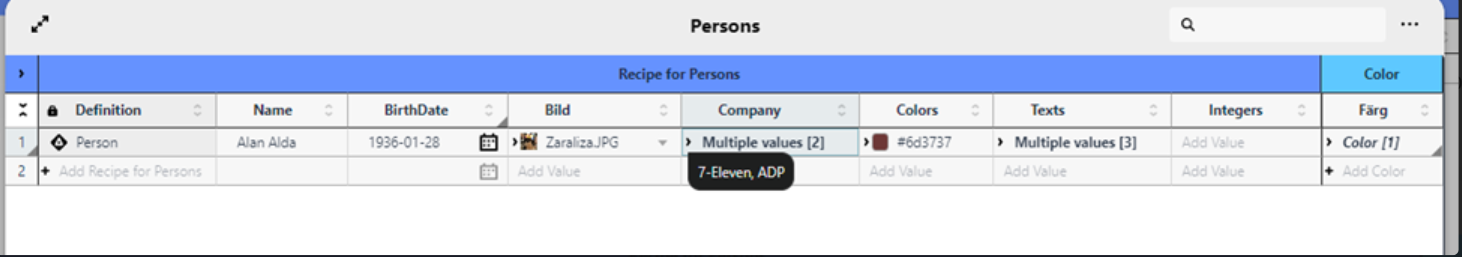 The text “Multiple values”, together with the number of values, are displayed in a cell that contains more than one value. A tooltip displays the values.