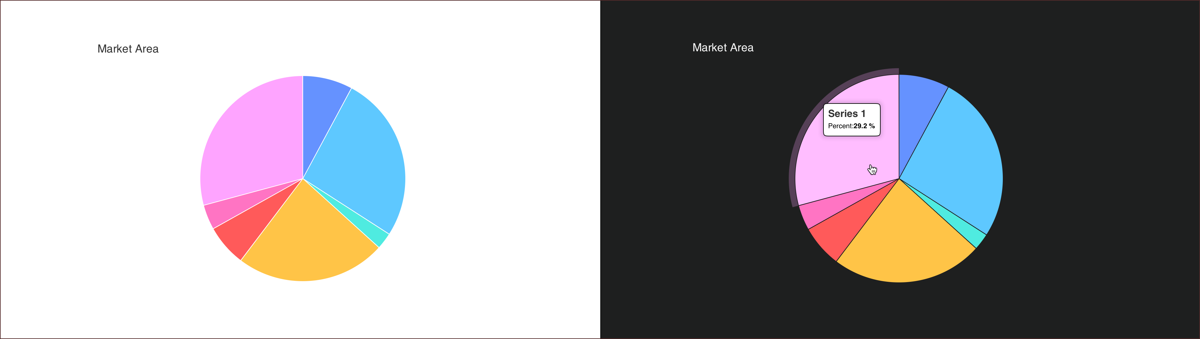 Example of the default chart colors in pie charts with light and dark backround.