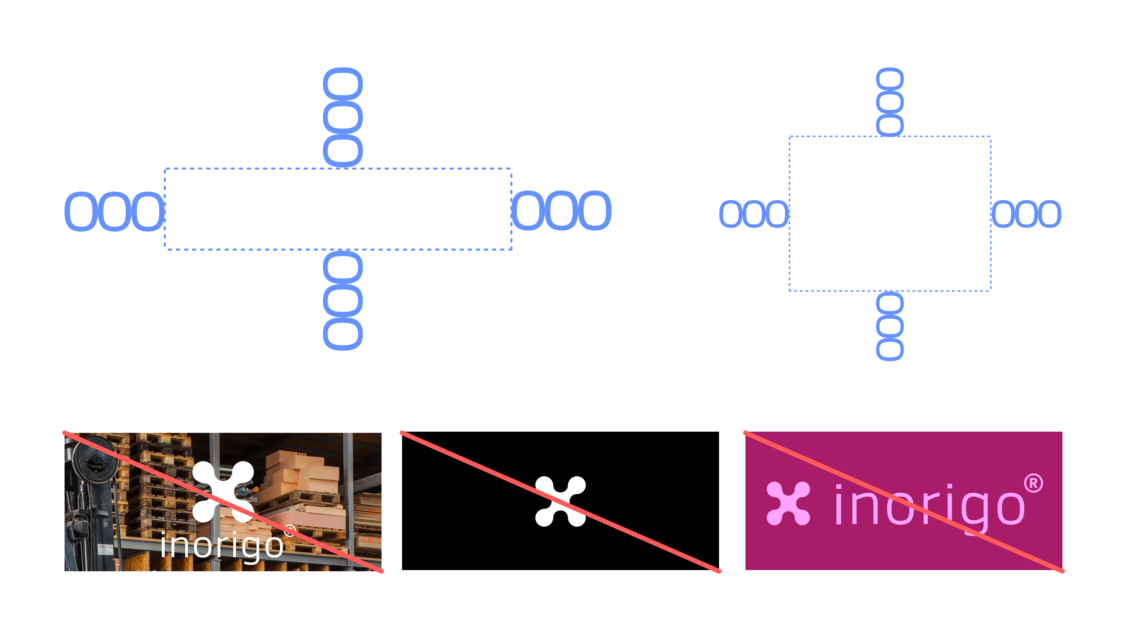 Examples of white space requirements and logo "Dont's" from inorigo's brand guidelines.