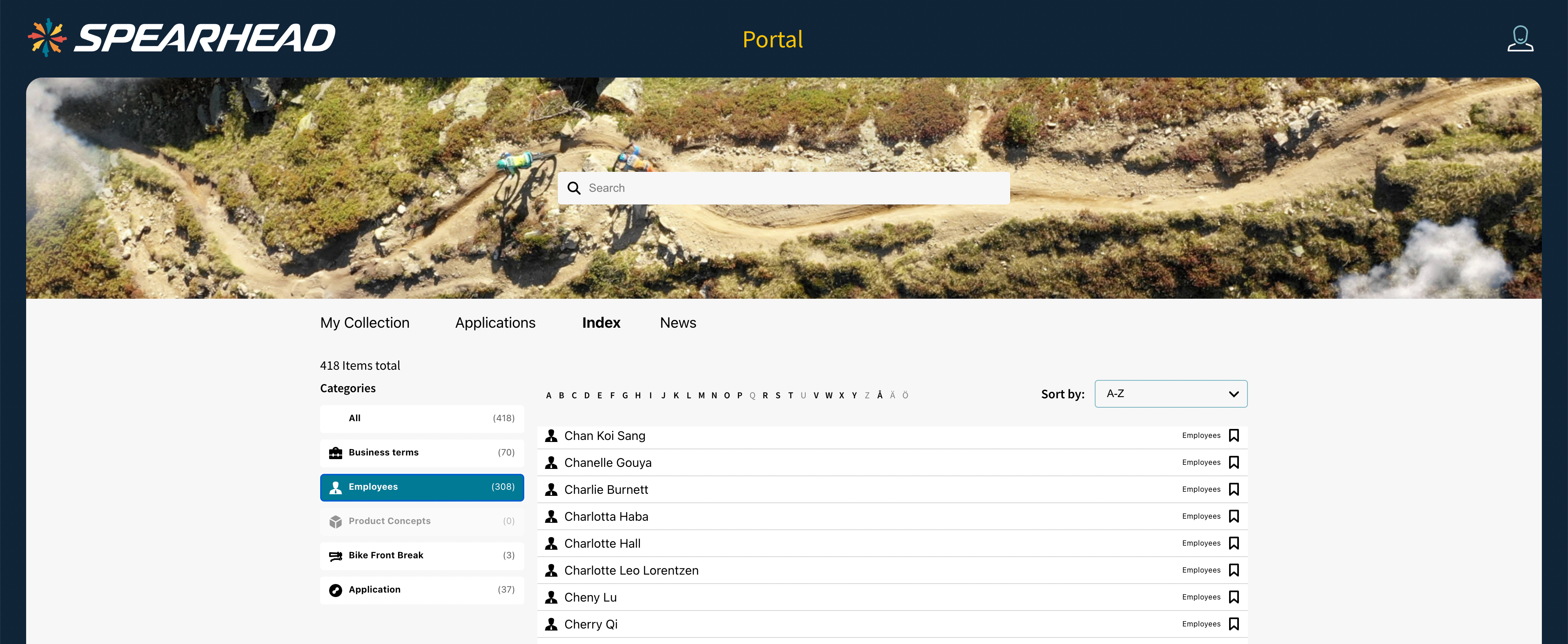 The Portal's Index page lists all content in the portal and can be filtered on different categories. It is possible to customize the state of a category when it is selected. When unselected the category appears white with black text.
